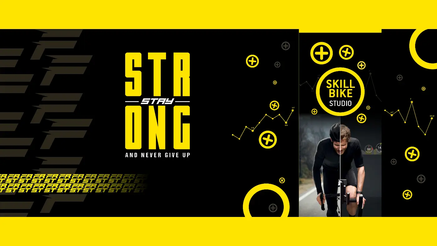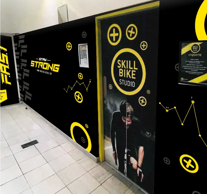 A high-contrast yellow and black palette was chosen to communicate energy, focus and strength. Yellow brings visibility and intensity, energising the studio environment, while black anchors the identity with authority and discipline. Together, the colours create a powerful visual presence that stands out within the leisure complex.