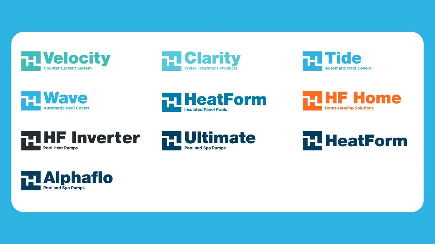 Lighthouse Pools also operate an in house brand, HeatForm. We were asked to refresh the existing logo suite to create a more cohesive system, as well as design new HeatForm logos for upcoming products. This work was supported by a revised colour palette to strengthen recognition across the range.