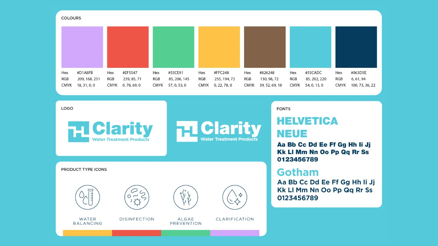 One of the new HeatForm brands, Clarity, is a water treatment product range. We developed a clear and flexible labelling system using four colours to distinguish the four stages of water treatment. Alongside this, we created a template to support white label products.